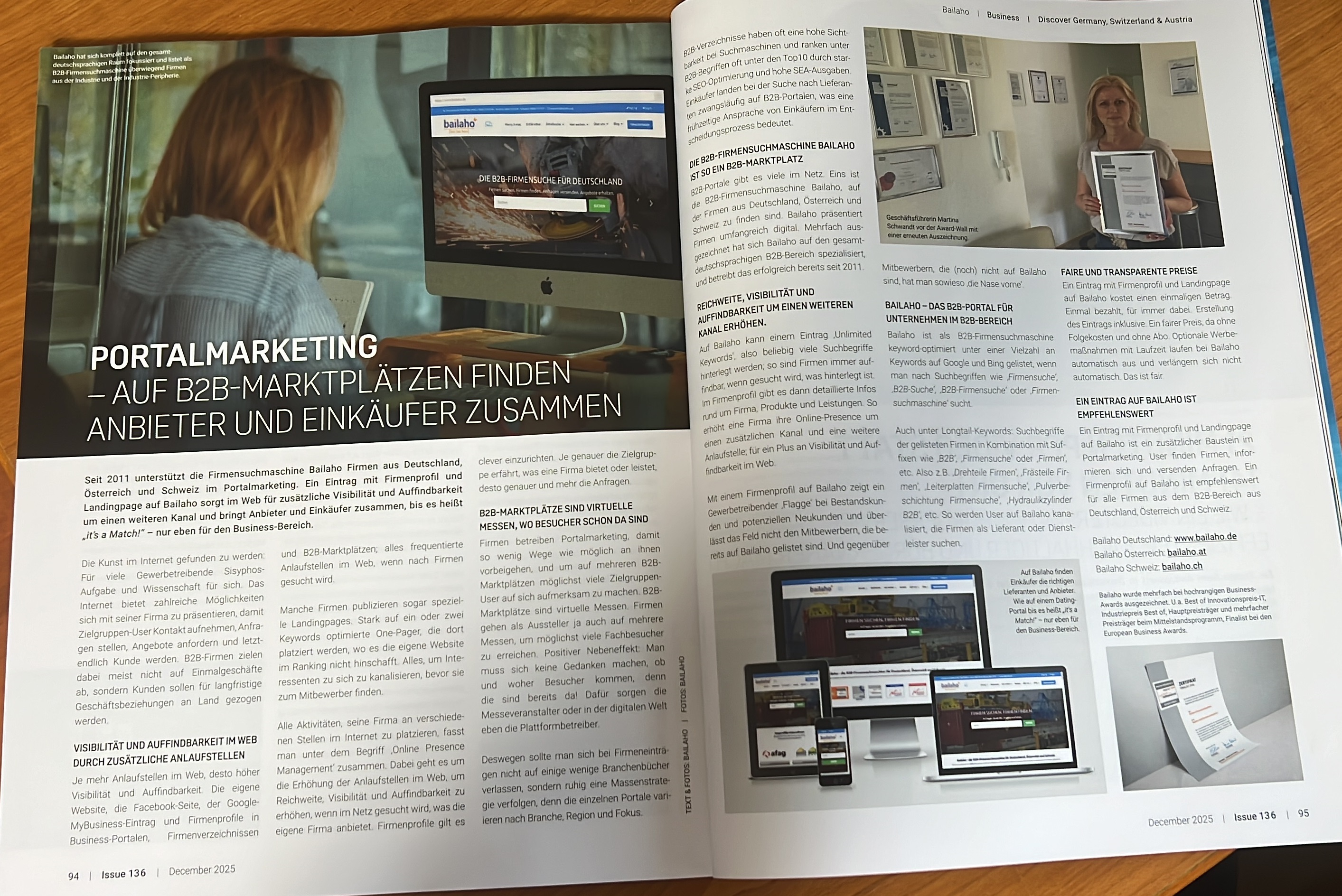 Bailaho freut sich über einen zweiseitigen Bericht über die B2B-Firmensuchmaschine in der Dezember-Ausgabe des Print-Magazins "Discover Germany Austria Switzerland" in Form eines Advertorials.